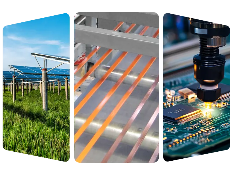 • Réimse fótavoltach: olltáirgeadh ribíní táthaithe fótavoltach agus barraí bus chun cuidiú le comhpháirteanna leictreachas a sheoladh go héifeachtach.